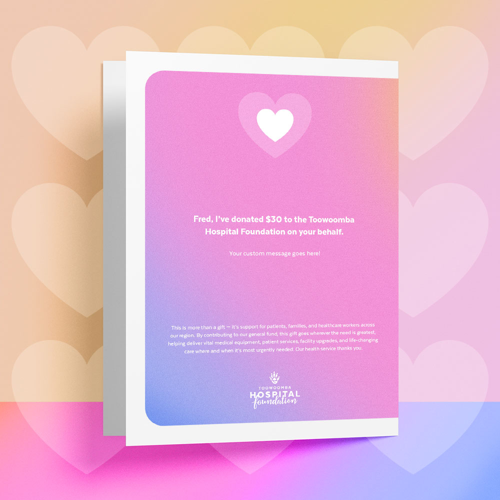 Every digital card makes a real difference. You’re helping fund essential care, improve hospital spaces, support medical staff, and bring better health outcomes to people right across the Darling Downs and South West. This is more than a card — it’s a way to support our entire community.